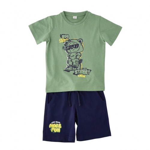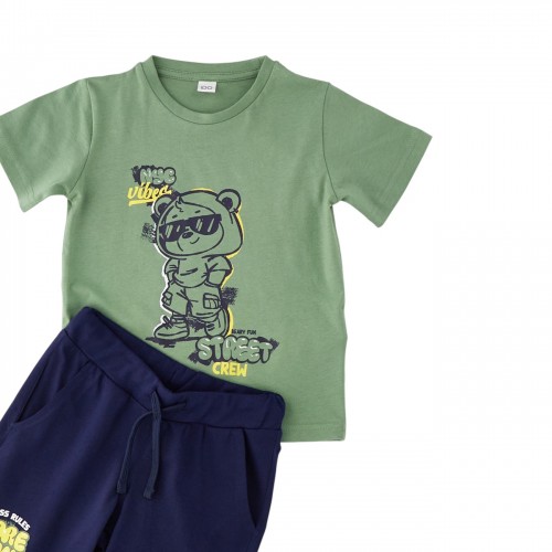 Το σετ αυτό διαθέτει μπλουζάκι σε πράσινη απόχρωση με στάμπα και μπλε βερμούδα με λάστιχο στην μέση.
